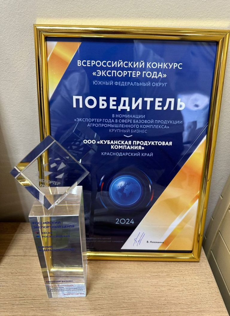 Кубанская Продуктовая Компания заняла 1 место в номинации «Экспортёр года в сфере базовой продукции АПК крупный бизнес «.